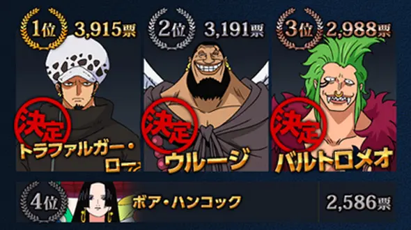 A Banpresto anunciou os resultados das votações para escolher os personagens de One Piece a serem retratados por diversos escultores na 5ª edição da competição de action figures Banpresto Figure Colosseum: Zoukeiou Chojho Kessen.